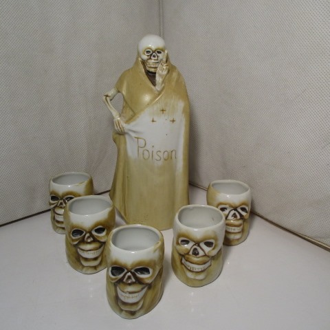 | 在庫状況 | 在庫あり | <詳細> スカル〜死神モチーフのポイズンボトル:デカンタとショットグラス5個のセットです。 陶器 日本製(MADE IN JAPANのスタンプ有) ・蓋のコルクに若干の減りがあります ・僅かなキズ、ペイントロス、汚れ等はありますが、非常に良いコンディションです。 |