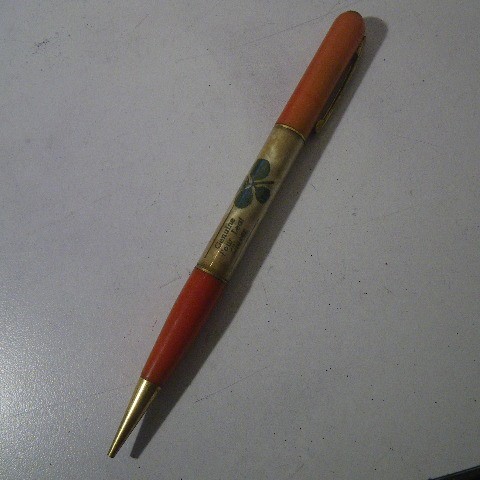 | 在庫状況 | SOLD | <詳細> 古い年代のメカニカルペンシル:シャープペンです。ペン先を持って、ボディー部分を回転させると芯が出てくる回転式ペンシルです。 ボディーに四葉のクローバーが入っています。犬小屋のアド物です。 多少の小キズ、錆びはありますが気にならない程度です。回転式の機構は正常に動作します。芯太さ:1.1mm |
